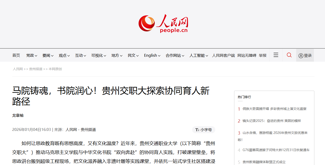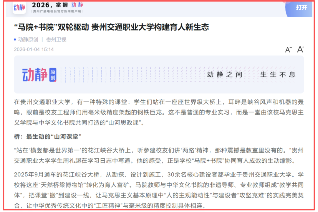 1月4日,动静新闻发布文章《“马院+书院”双轮驱动 贵州交通职业大学构建育人新生态》报道我校协同育人新路径。全文如下: 在贵州交通职业大学,有一种特殊的课堂:学生们站在一座座世界级大桥上,耳畔是峡谷风声和机器的轰鸣,眼前是校友工程师们用毫米级精度架起的钢铁巨龙。这不是普通的专业实习,而是一堂由该校马克思主义学院与中华文化书院共同打造的“山河思政课”。桥:最生动的“山河课堂”“站在‘横竖都是世界第一’的花江峡谷大桥上,...