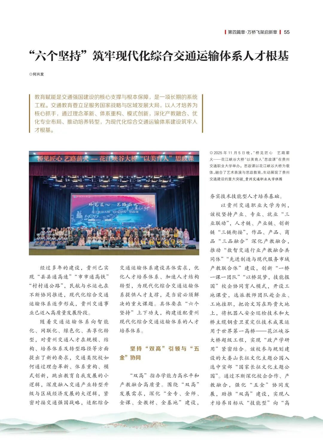 近日,《当代贵州》——“大道兴黔”特刊刊发我校党委书记何兴发署名文章《“六个坚持”筑牢现代化综合交通运输体系人才根基》。文章立足贵州交通事业迈入高质量发展阶段的时代背景,深刻阐述了交通类院校在服务交通强国战略中的使命担当,从“双高”引领、专业布局、多维转型、融入战略、前瞻布局及坚守本位等六个维度,系统提出了“六个坚持”的人才培养路径,深入阐述了交通类院校如何通过理念革新与模式创新,为交通强国建设筑牢人才根基。...