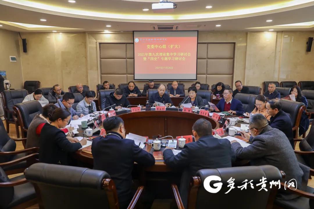 11月26日,贵州交通职业技术学院(以下简称贵州交通职院)召开党委中心组(扩大)2021年第九次理论集中学习研讨会暨“四史”专题学习研讨会。省委党史学习教育第九巡回指导组副组长蒋益华,成员申永恒、江莉、孙良政到会指导。