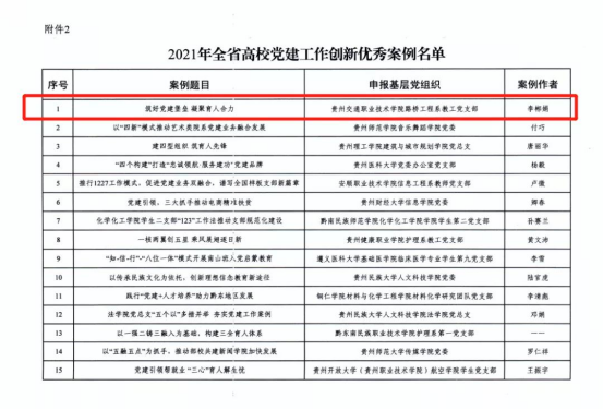 近日,省委教育工委公布2021年全省高校党建工作创新案例名单。我院路桥工程系教工党支部申报的《筑好党建堡垒 凝聚育人合力》、基础教学部教工党支部申报的《党建铸魂育新人—126“干支”党建铸魂工作法》两案例入选2021年全省高校党建工作创新优秀案例名单。路桥工程系教工党支部:《筑好党建堡垒凝聚育人合力》路桥工程系教工党支部以党建为引领,压实政治责任,通过创新党员“五色”教育模式、繁荣红色交通校园文化、培育支...