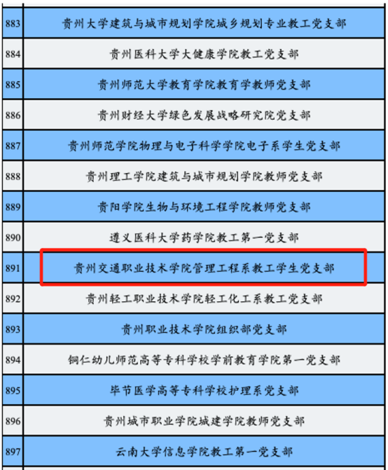 管理工程系教工学生党支部获批全国党建工作样板支部培育创建单位据《教育部办公厅关于开展第三批新时代高校党建示范创建和质量创优工作的通知》(教思政厅函〔2021〕16号)安排和遴选工作方案,经省级党委教育工作部门推荐、资格审查、专家推荐、教育部党的建设和全面从严治党工作领导小组成员单位集中审议、结果公示,管理工程系教工学生党支部获批全国党建工作样板支部培育创建单位。 贵州交通职业技术学院管理工程系教工学...