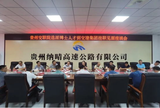8月18日,学院选派博士到交建集团挂职见面座谈会在纳晴高速公路有限公司召开。交建集团总经理助理、人力资源部主任、团委书记朱明聪,贵州交通职业技术学院党委委员、组织人事处处长饶晓微,路桥工程系有关负责人、挂职博士,纳晴公司、六安公司相关人员参加座谈,会议由纳晴公司党支部书记、董事长谢方臣主持。 会上,朱明聪宣读了刘建宁、马宗源、苏艺3名博士挂职文件,饶晓微介绍博士基本情况,刘建宁、马宗源先后分享体会。...