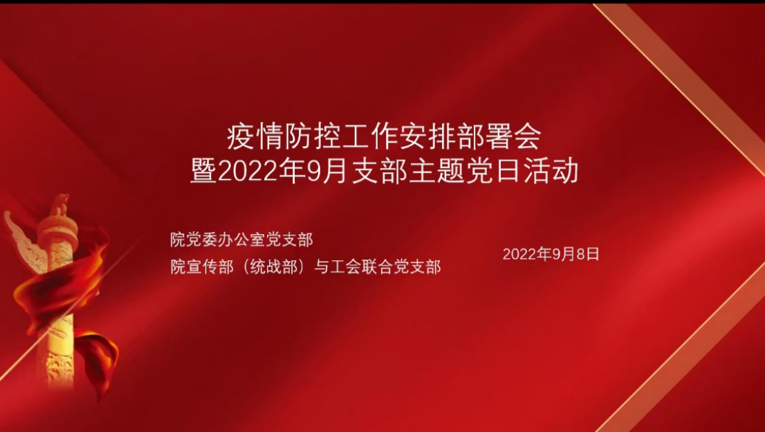 【同心抗疫共“筑”防线】党办党支部和宣传部(统战部)与工会联合党支部开展“疫情防控 党员先行”主题党日活动为进一步发挥党组织在校园疫情防控中的堡垒和党员先锋模范作用,9月8日晚,学院党委办公室党支部和宣传部(统战部)与工会联合党支部通过腾讯会议线上开展“疫情防控 党员先行”主题党日活动,两个支部全体党员参加了本次活动,活动由党委办公室党支部书记李晓艳同志主持。 会议传达学习了习近平总书记关于疫情防控...