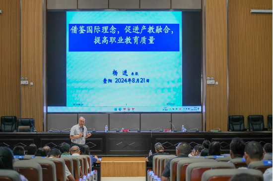8月21日,中国常驻联合国教科文组织原大使衔代表,教育部职业技术教育中心研究所原所长杨进教授受邀来校,为全校教师带来“借鉴国际理念,促进产教融合,提高职业教育质量”主题讲座。校办、教务处、质控办、科研处和实训中心领导、各系部负责人参加讲座。讲座由贵州省教育厅原二级巡视员胡晓主持。 讲座中,杨进教授围绕“学习”与“教育”的关系,学习的发生机制,职业教育的质量等主题展开。并结合神经科学知识,深入剖析了人脑的神经结构,...