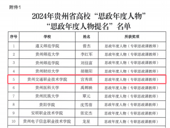 近日,省委教育工委、省教育厅正式印发《省教育工委 省教育厅关于公布“思政年度人物”“思政年度人物提名”“思政新秀”评选结果的通知》,我校马克思主义教学部教师宫秀琪、熊燕霞分别入选“思政年度人物(专职思政课教师)”和“思政新秀(宣传队伍)”。 宫秀琪,基础教学部教工第二党支部书记,马克思主义教学部实训、科研及社会服务秘书。她十年躬耕教坛,坚守初心,先后获得首届全国高校思想政治理论课教学展示活动二等奖、贵州省高校思想政治理论课教学展示活动一等奖等奖项,...