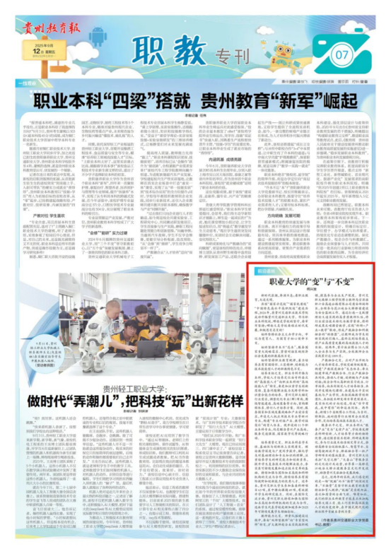 9月12日,《贵州教育报》职教专刊在“前沿语丝”版块刊发我校党委书记何兴发的署名文章《职业大学的“变”与“不变”》。 文章以我校在职业本科建设上的三个“不变”和五个“变”为切入口,深刻阐述了我校升格为职业本科以来,如何坚持社会主义办学方向“不变”、职教属性“不变”、职教特色“不变”,在做到升本不“忘本”的同时,精准把握时代机遇,紧密对接产业需要,在培养目标、培养质量、教师能力、产教融合和服务水平等方面实现“...