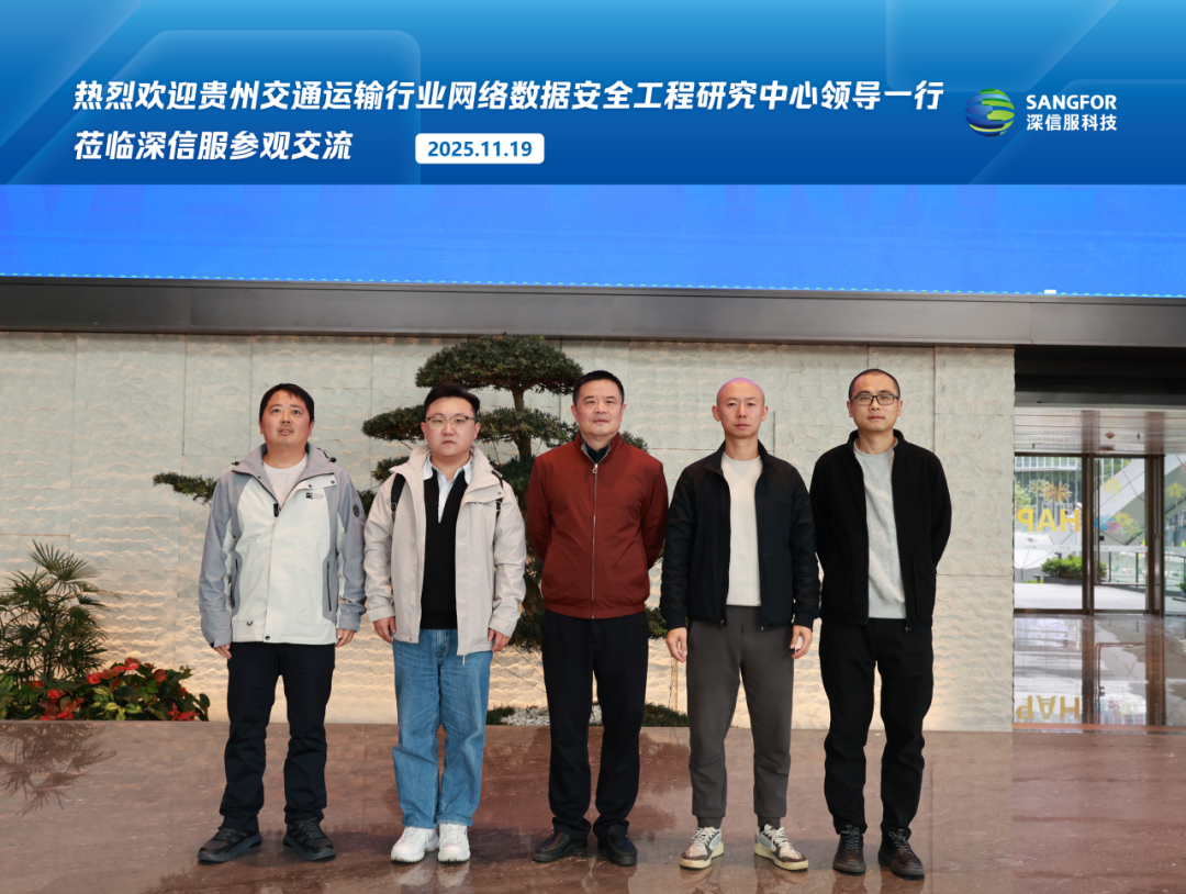 近日,交通运输行业网络数据安全工程研究中心团队赴深信服科技股份有限公司调研交流,并现场获授 “贵州区域交通运输行业安全运营服务资质(高级)”授权书。工程研究中心团队重点参观了公司MSS运维中心,了解了深信服科技在网络安全运营、威胁检测、应急响应等方面的技术与服务体系,并就数据安全防护、安全托管服务联合运营等议题展开了深入交流并达成合作共识。此次认证将进一步推动双方在交通运输行业网络数据安全领域的资源共享与协同创新,...
