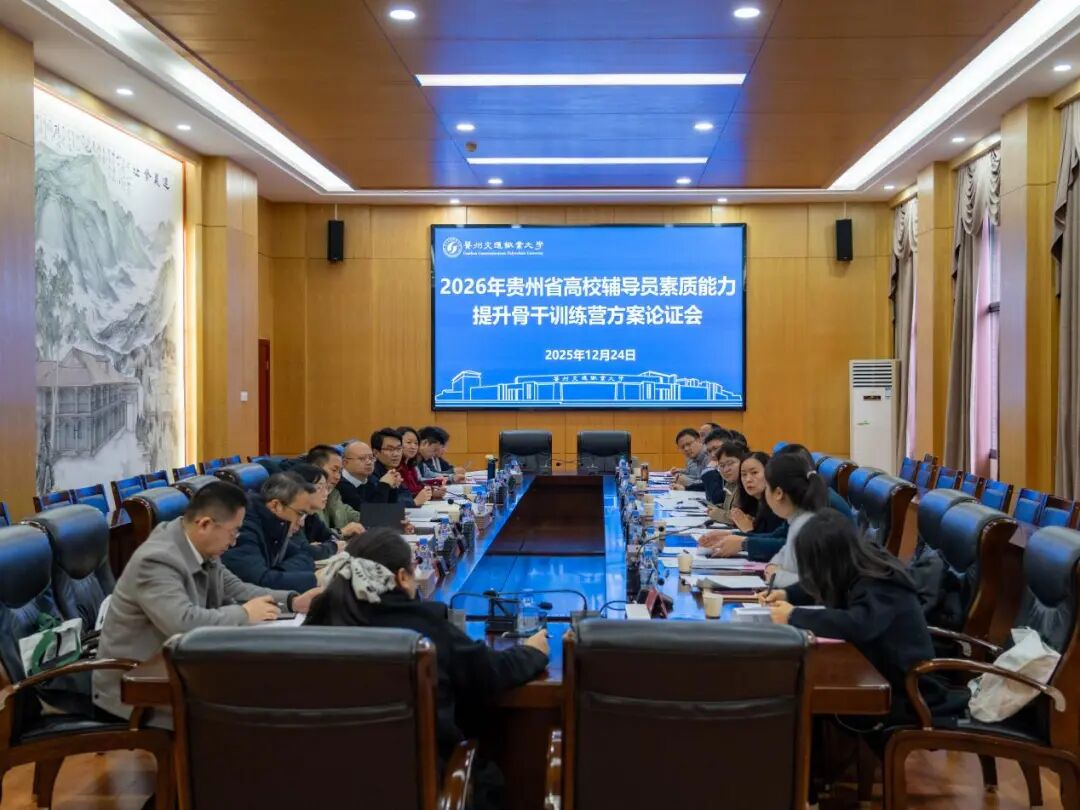 12月24日,我校组织召开2026年贵州省高校辅导员素质能力提升骨干训练营方案论证会。省教育厅相关处室同志和有关高校(专家)领导参会指导,我校党委副书记杨再豪及辅导员学院相关负责人参加会议。会上,辅导员学院副院长肖梅汇报了《2026年贵州省高校辅导员素质能力提升骨干训练营方案》,重点围绕内容模块构建、组织保障措施等方面作了详细说明。与会专家立足全省辅导员队伍建设实际,结合历届辅导员骨干训练营承办经验,聚焦当前存在的重点难点问题,...
