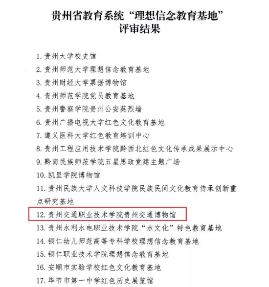 近日,省委教育工委、省教育厅发布《关于贵州省教育系统“理想信念教育基地”申报评审结果的公示》,经专家通过网络初审、实地考察、召开评审会等,共21家单位拟被评选为为教育系统“理想信念教育基地”。其中,贵州交通职业技术学院贵州交通博物馆成功入选。编 辑丨金 文责 编丨詹黔