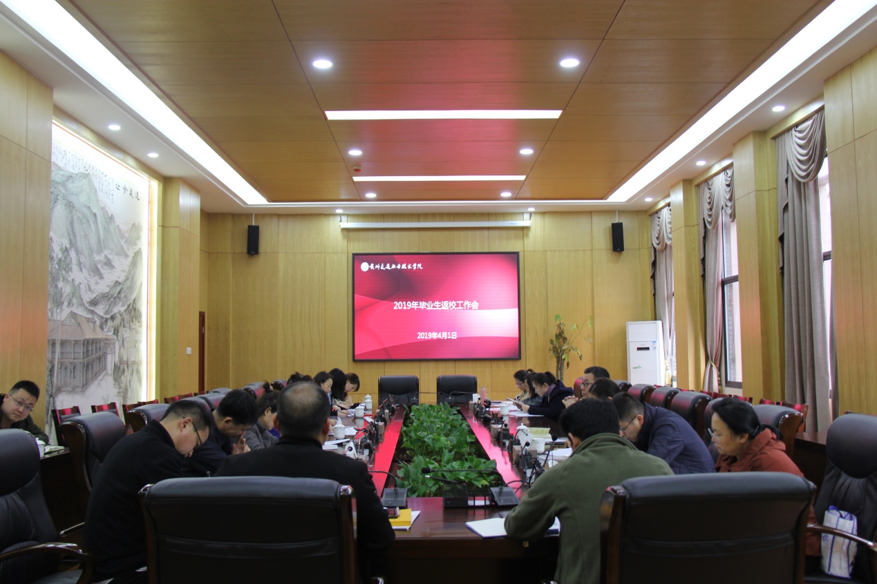 4月1日,学院在清镇校区礼堂209会议室组织召开2019届毕业生返校工作部署会,就返校时间及手续办理地点、学籍处理、学费清缴、离校清单、毕业证办理、返校住宿、安全稳定、校园文化氛围营造等方面的事宜作安排部署。 ...