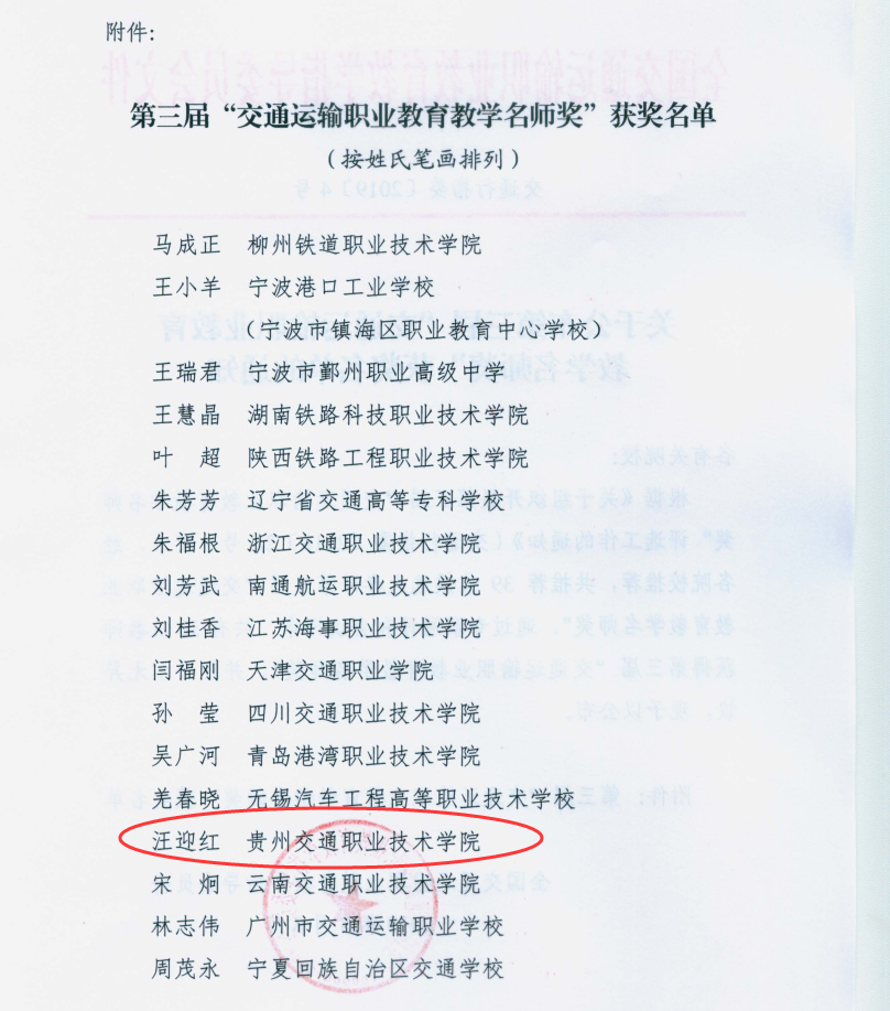 近日,全国交通运输职业教育教学指导委员会公布了第三届“交通运输职业教育教学名师奖”获奖名单,我院建筑工程系专职副书记汪迎红教授上榜。 据悉,本次评选主要针对全日制高等职业院校和中等职业院校从事交通运输...