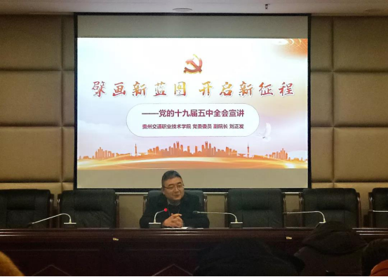 为深入学习贯彻党的十九届五中全会精神,12月15日,学院党委委员、副院长刘正发同志组织专题宣讲。学院图书馆、招就中心、科研处、教务处、路桥系、汽车系、信息系、基础部等部门全体党员同志参加学习。宣讲从四个层面展开。国家层面,学习党的十九届五中全会精神,解读《中共中央关于制定国民经济和社会发展第十四个五年规划和二〇三五年远景目标的建议》。省厅层面,传达贵州省交通运输厅“十三五”时期交通领域主要工作总结...