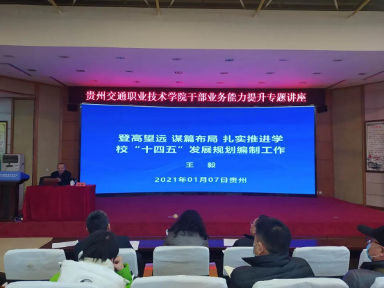 为进一步提升学院干部业务水平,厘清"十四五"发展规划编制思路,推动"中特高"建设绩效评价工作,1月7日学院2021年度干部业务能力提升专题培训暨党委理论学习中心组(扩大)学习专题报告会在学院阳关校区道德讲堂举行。学院全体领导班子成员及副科级以上干部参加本次培训。此次专题培训分为两场,全国职业院校教学工作诊断与改进专家委员会副主任王毅教授为主讲人。王毅在《登高望远谋篇布局扎实推进学校“十四五”发展规划编制...