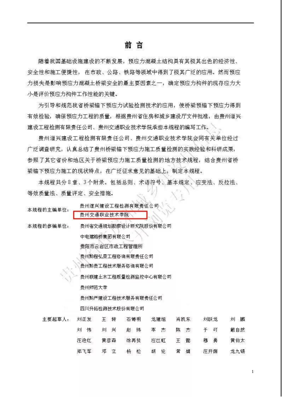 由学院路桥专业群牵头主编的贵州省地方标准《桥梁锚下预应力检测技术规程》DBJ52/T106-2021自2021年9月1日起正式实施。这也是我院路桥专业群聚焦“高墩大垮桥梁”打造专业群核心竞争力,提升技术技能创新服务能力的又一成果。《桥梁锚下预应力检测技术规程》DBJ52/T106-2021经过广泛调查研究,认真总结了贵州省桥梁预应力施工质量检测的实践经验和科研成果,参照相关省份关于桥梁预应力施工质量检测的地方标准,结合贵州省桥梁...