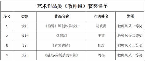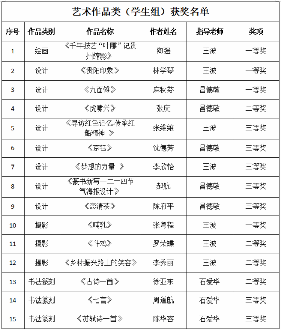 全省第七届大学生艺术展演活动暨全省首届“美的教育”高校师生书画设计作品展评选已经结束啦,我校师生荣获了很多不同的奖项,让我们一起来看看获奖名单吧: