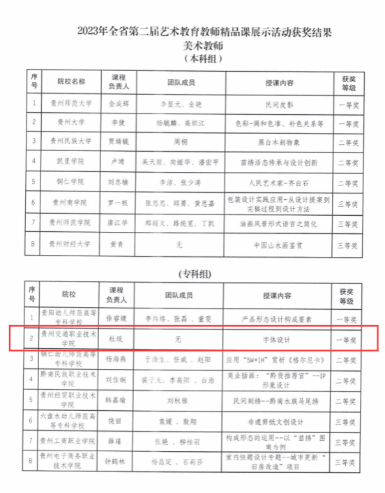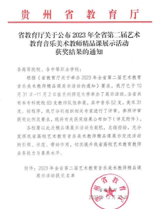 12月20日,贵州省教育厅公布2023年全省第二届艺术教育音乐美术教师精品课展示活动获奖结果,我院管理工程系教师杜琰荣获“专科组(美术)”一等奖。