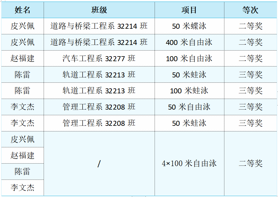 本次比赛由中国大学生体育协会主办,内设甲乙丙丁四个组别,分别开展自由泳、蛙泳、仰泳和个人混合泳,以及4×100米自由泳、混合泳等22个项目。在本次赛事中,我院代表队由体育教研室主任罗文全带队,黄旭、徐顺姬和江忠海担任指导教师,来自道路桥梁与工程、轨道工程、管理工程以及汽车工程等专业的4名同学作为运动员代表参赛。