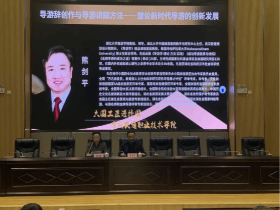 熊剑平从新时代导游的发展趋势、导游词的创作方法与技巧以及导游讲解方法三个方面展开论述,他旁征博引、字字珠玑,兴之所至,高歌一曲湖北民歌《跑四回》。熊剑平教授用全新的旅游发展思维、全局的战略视野引导同学们对旅游专业的发展有了新的认识。