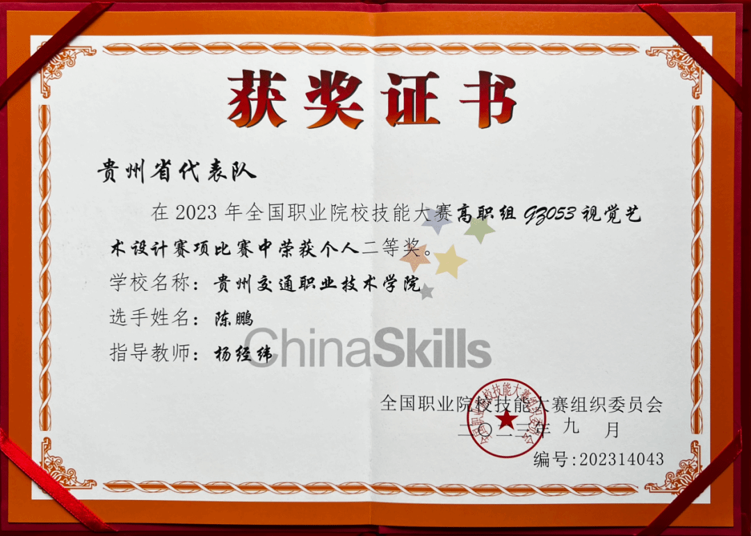 9月28日,2023年全国职业院校技能大赛高职组视觉艺术设计赛项圆满落幕。我院管理工程系艺术设计专业学子陈鹏斩获全国二等奖,是本次全国职业院校技能大赛高职组视觉艺术设计赛项中贵州省参赛代表队所获的最高奖项。