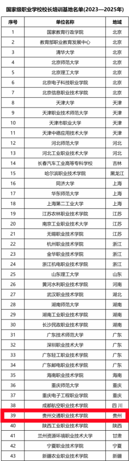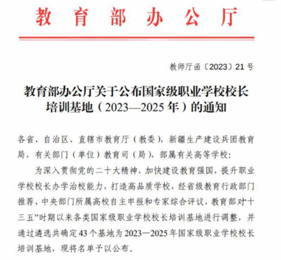 近日,教育部办公厅印发了《关于公布国家级职业学校校长培训基地(2023-2025年)的通知》(教师厅函〔2023〕21号),遴选确定43个国家级职业学校校长培训基地,我院是贵州省唯一入选单位。