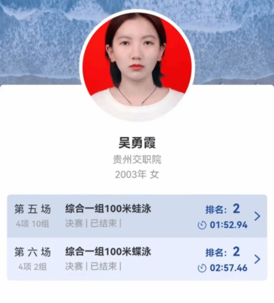 此次比赛,全省高等院校不分专业组与非专业组,我院学生吴勇霞与来自全省其他高校的运动员们同场竞技,不畏强手、奋力拼搏,充分展现出运动员昂扬向上的精神风貌和力争上游的竞技姿态,分别荣获100米蛙泳和100米蝶泳第二名的好成绩。