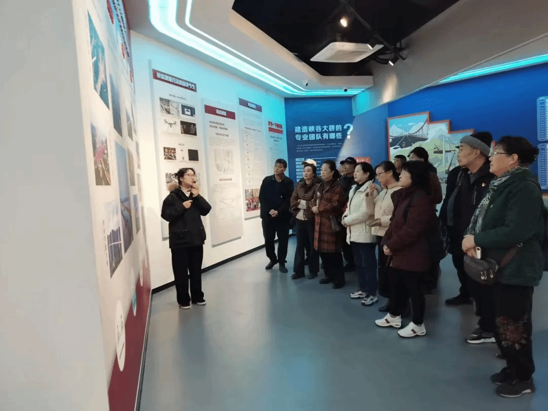 在桥梁博物馆,工作人员详细介绍了贵州桥梁发展历程和贵州桥梁建设的创新型技术成就。老干部们通过VR虚拟技术观看桥梁施工动画,了解桥梁零部件,并身临其境般地参与建桥游戏和模型搭建等。在坝陵河大桥内部,老干部们近距离参观坝陵河大桥雄伟壮观和内部结构。参观完毕,大家无不赞叹我国交通运输事业取得了如此举世瞩目的发展成就。
