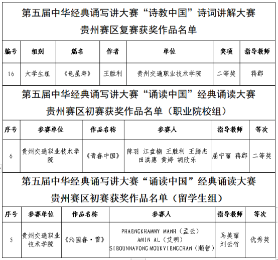 近日,由基础教学部指导选送的学生作品《龟虽寿》《青春中国》在第五届中华经典诵写大赛——“诗教中国”诗词讲解大赛和“诵读中国”经典诵读大赛中分别荣获贵州省二等奖,并成功入围全国决赛。