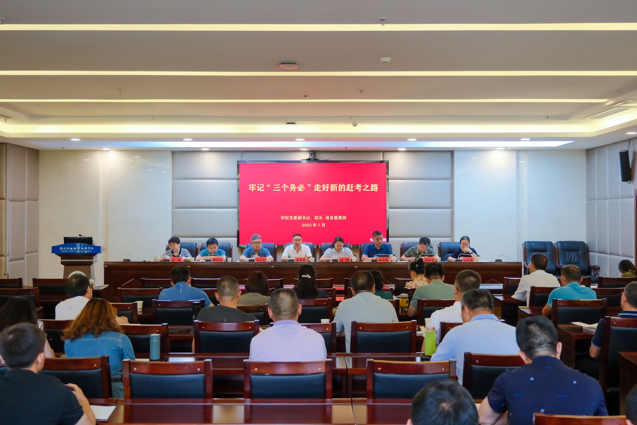 7月17日下午,学院党委副书记、院长、学院主题教育领导小组副组长吴有富以“牢记三个务必 走好新的赶考之路”为题为学院县处级以上党员干部、主题教育办工作人员讲授主题教育专题党课,省委主题教育第十四巡回指导组成员、国家税务局印江县税务局机关党委(党建工作股)主任杨胜康到会指导。学院党委副书记、学院主题教育领导小组办公室主任刘正发主持。