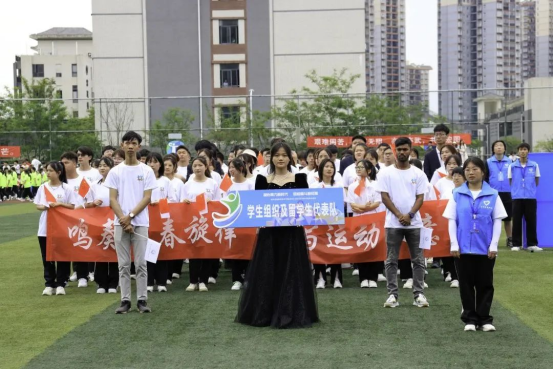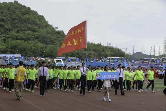 入场仪式上,国旗队、校旗队、会旗队、会徽队、教职工代表队、裁判员代表队、学生组织及留学生代表队、退伍军人及预征班学生代表队、各系部代表队迈着整齐的步伐、喊着响亮的口号依次入场,方队中,路桥工程系的桥梁模型、汽车工程系的巴哈赛车、建工系的测量工具和无人机队伍、轨道系的列车模型不仅彰显了系部的办学特色,也为在场师生留下了深刻的印象。