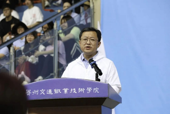 副院长詹黔江致辞,他表示,体育是教育事业的重要一环,是增强体质的重要途径,是促进人的全面发展的必然要求。运动会是体现人的身体素质、精神状态和意志力等综合能力的一种活动,不仅是体育竞技,更是展示综合素质的平台。詹黔江勉励同学们,既要怀抱梦想又要脚踏实地、既要敢想敢为又要善作善成,不断突破自我,追求卓越,努力成长为德智体美劳全面发展的青年。詹黔江对运动员和裁判员提出要求,并预祝全体运动员取得优异成绩,预祝运动会圆满成功。