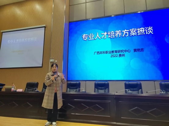 广西职业教育与成人教育学会会长、广西本科职业教育研究中心副主任、南宁师范大学黄艳芳教授以《专业人才培养方案摭谈》为题,围绕职业面向、专业核心课程及课程内容、毕业生能力要求及指标点、专业人才培养模式进行详细讲解,深入浅出地阐释了人才培养方案的修订与实施。她强调,教师要明确职业核心能力,将岗位能力要求转化为教学内容,推进人才培养模式改革和课程体系重构,优化专业人才培养方案,为学生成长成才提供标准化依据。