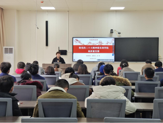 为深入学习宣传贯彻党的二十大精神,紧扣习近平总书记在党的二十大报告中对加快建设教育强国、科技强国、人才强国,加快建设高质量教育体系等方面提出的新要求、新部署,12月2日,学院党委委员、副院长吴薇在笃通楼一楼研讨室宣讲党的二十大精神,学院图书馆、科研处、继续教育学院、信息工程系全体党员及入党积极分子参加学习。