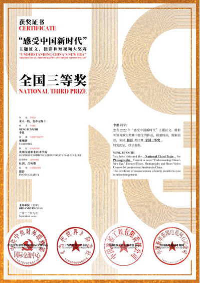 近日,“感受中国新时代”大奖赛颁奖活动在北京举行。我院2017届汉语言班柬埔寨籍李思同学的作品《水天一线,青春无悔》荣获摄影类大赛全国三等奖。