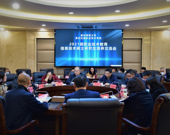 11月21日,贵州师范大学—贵州交通职业技术学院2021级职业教育·信息技术硕士研究生培养交流会在学院召开,贵州师范大学大数据与计算机科学学院院长胡圣波一行、贵州交通职业技术学院相关联合培养导师及2021级硕士研究生参加会议,学院党委副书记、院长吴有富到场交流。