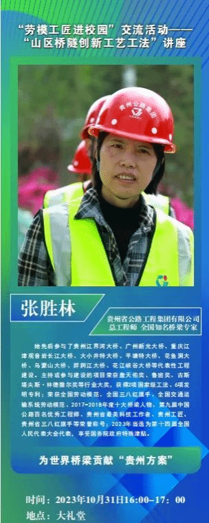 由交通运输部、人力社会资源部、全国总工会和团中央举办的第十四届全国交通运输行业“升拓杯”桥隧工(职工组)职业技能大赛和第十四届全国交通运输行业“南方测绘杯”桥隧工(学生组)职业技能大赛将于明日拉开帷幕。为持续丰富大赛比赛日程,10月31日,“全国劳模·大国工匠进校园”交流活动面向全国参赛队伍、指导教师在贵州交通职业技术学院开讲。