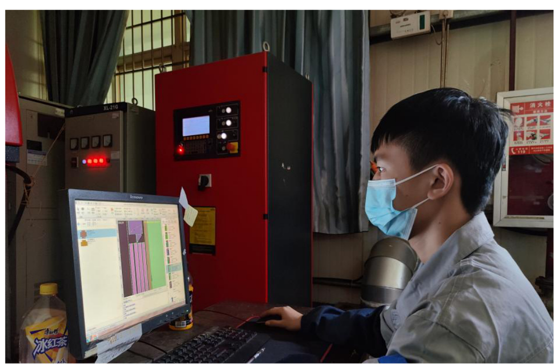 王显钢同学所在的工作岗位是金工-激光下料,主要负责对零件的生产制造,CAD图纸处理和CYP图纸排版以及零件下料。需要先将零件图纸在电脑上排版好,将其程序保存到与激光切割设备共享的文件夹里面,在激光切割设备上调取出来后进行校对进行切割。疫情期间面对巨额的订单和新的岗位安排,他虚心请教,踏实肯干,为车间的正常运行发挥了重要作用。