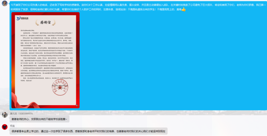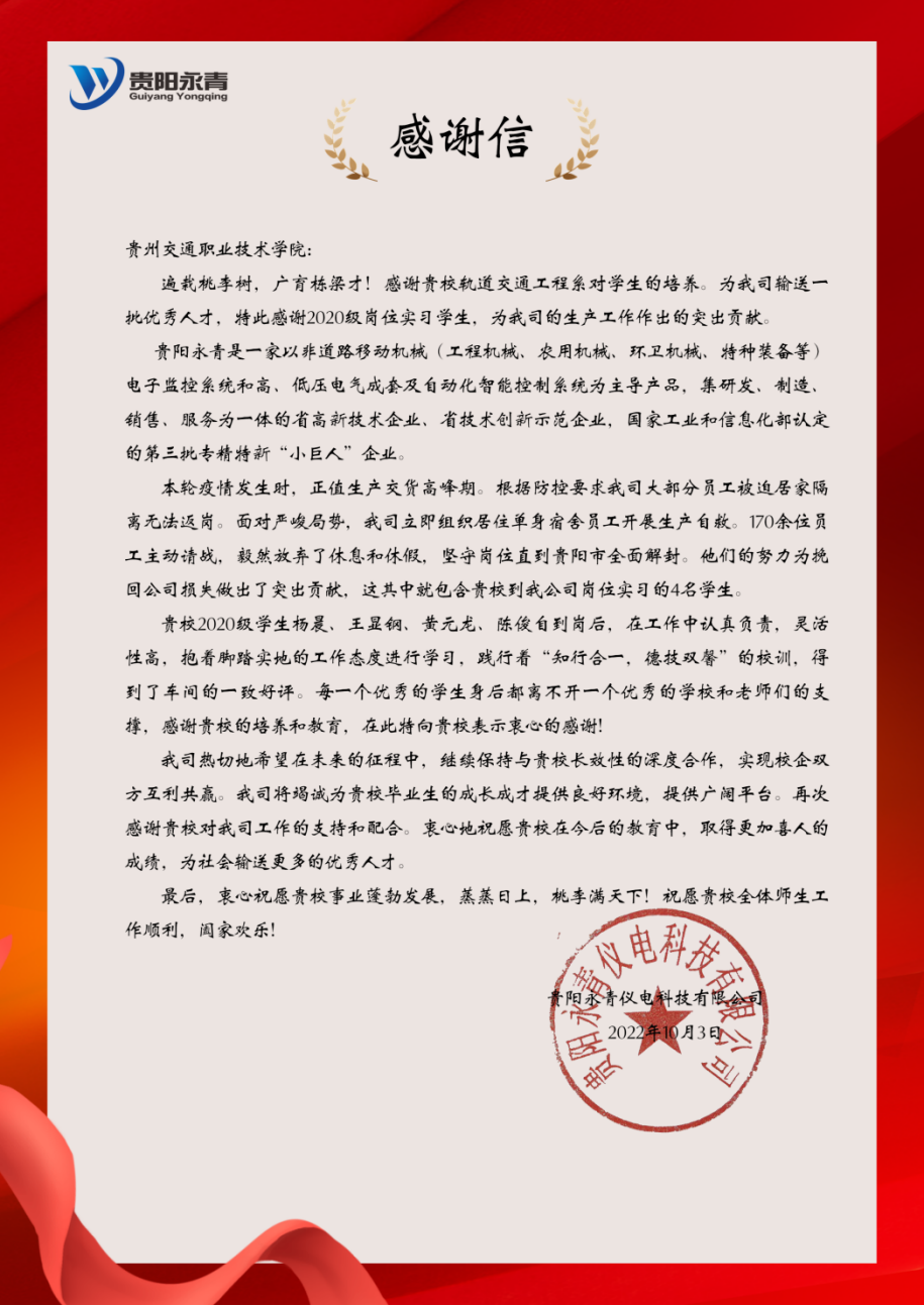 10月3日,学院收到一封来自贵阳永青仪电科技有限公司的感谢信,信中指出,本轮疫情发生时,正值生产交货高峰期,我院轨道交通工程系2020级顶岗实习的4名同学毅然放弃了休息和休假,主动请战生产一线,一直坚守到贵阳疫情全面解封,为挽回公司损失作出了突出贡献。