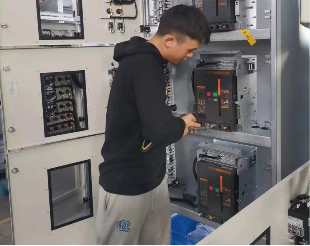 陈俊同学的工作内容主要是根据图纸来进行配电箱等产品的架装,比如在轨道项目中负责柜体外的架装,以及根据图纸来进行竖直铜牌和内部机械的安装,具体是通过图纸来判断母线架的位置大小,如位置不对,需要使用钻孔机械去对柜体进去重新钻洞,对铜牌进行保护列等操作。当接到车间主任电话的第一时间立即前往工作岗位直至今日,助力复工复产,得到车间上下的一致肯定和认可。