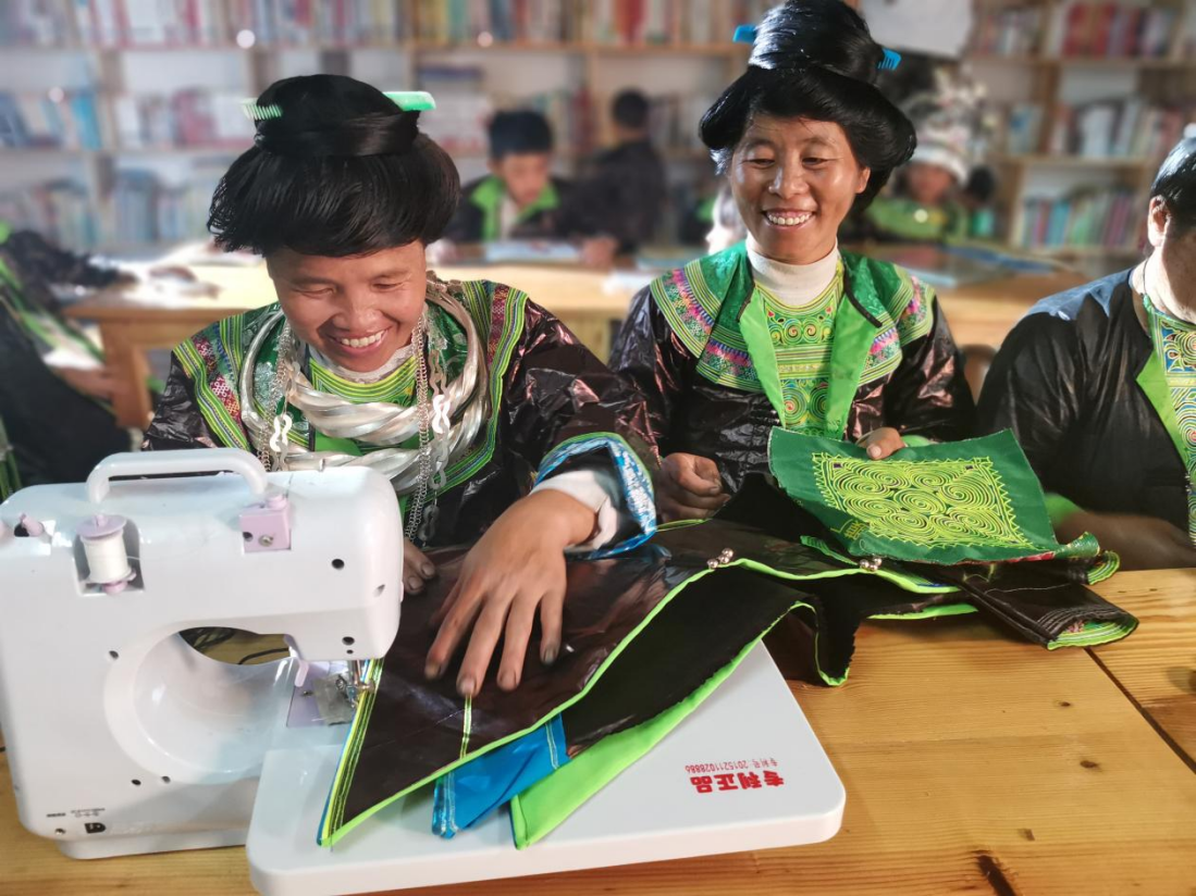 随着“一村一品”特色文化扶贫项目的确立,一个个农家书屋、刺绣合作社相继建成,学院及教职工自发捐赠的党建宣传、农业技术、儿童读物等5000余册书籍丰富了当地群众的精神生活。过去几年,200余名当地妇女成为了学院援建刺绣坊的绣娘,在刺绣坊里,学院不仅为绣娘们提供培训,还为制作出来的绣品联系销售渠道,绣娘们则在学院的帮扶下充分发挥自己的苗绣技艺,创收60余万元。学院从江籍学生梁兰以苗族刺绣为基础,创业“月乡苗伊”项目,获第七届中国国际“互联网+”大学生创新创业大赛贵州首金。这一举措为解决当地“留守儿童”和“空巢老人”问题提供了可行路径,“妈妈美绣娘 娃娃读书郎”不仅在当地和学院传颂开来,更是成为了学院在月亮山腹地开展文化帮扶的一张靓丽名片。