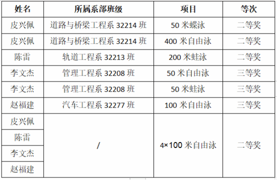 近日,第22届中国大学生游泳锦标赛(南方赛区)在贵州省遵义市奥体中心游泳馆成功举办,我院斩获二等奖3项,三等奖3项,并在接力比赛中荣获第三名,团体总分排名第五。