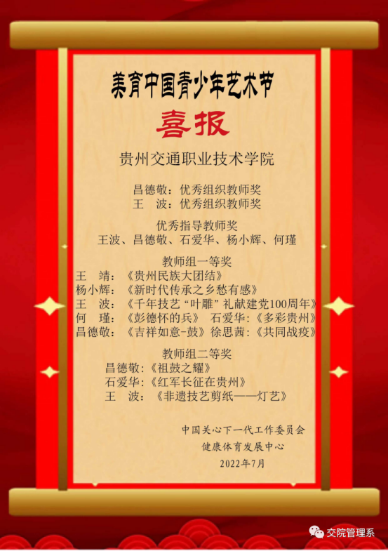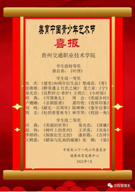 少年强则中国强!为贯彻习近平总书记对关心下一代工作的重要指示精神,促进下一代美育教育实践工作健康良性发展提供指导与服务,培养德智体美劳全面发展的社会主义接班人和建设者,中国关心下一代工作委员会健康体育发展中心与中国通俗文艺研究会联合开展美育中国青少年艺术节。我院管理工程系师生积极参加投稿,共获得特等奖、一等奖、二等奖、三等奖、优秀奖共49项。