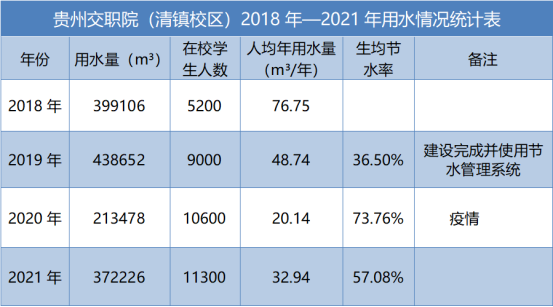 借助先进的物联网技术,实时对学院校内每栋建筑、每小时用水、人员定额用水管理,用水情况实时监测,通过微信公众号消息实时推送,一旦出现异常用水、超定额用水等情况及时把消息推送区域维修人员微信上,区域维修人员及时进行排查维修,有效杜绝长流水的出现。据总务处副处长董长贵介绍,经过3年的节水系统运维工作,2021年生均用水量为32.94m³/人,同比2018年节水率为57%,远低于行业用水指标先进值(45m³/人)。
