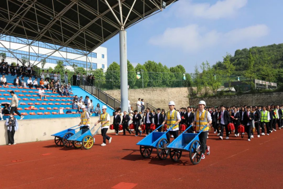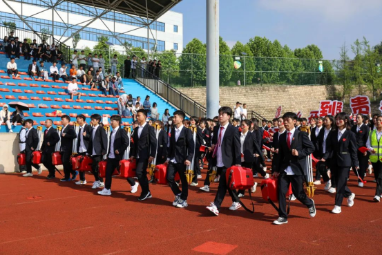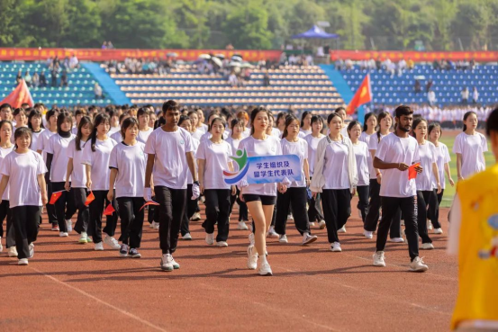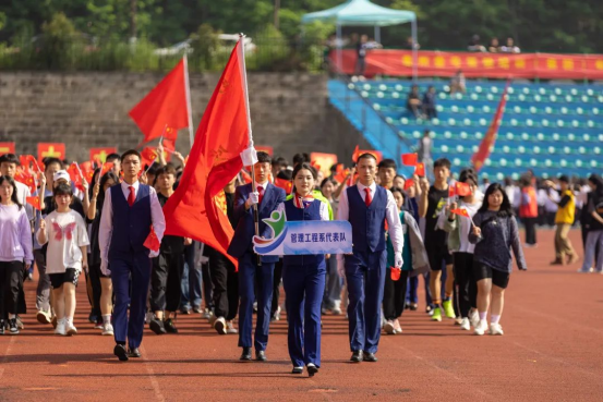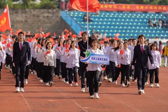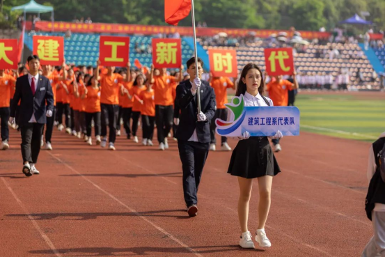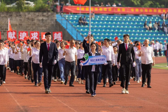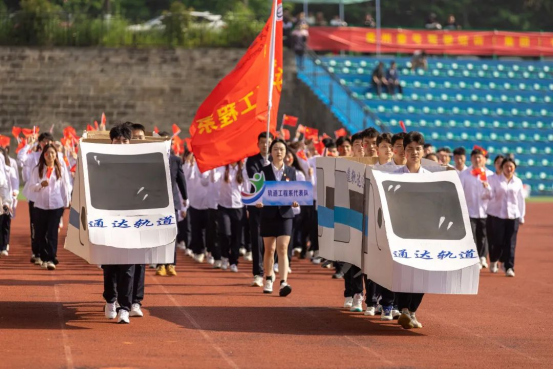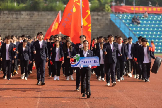 入场仪式上,国旗队、校旗队、会旗队、裁判员代表队、退役军人代表队、学生组织及留学生队及各系代表队迈着整齐的步伐、喊着响亮的口号依次入场,饱满的精神赢得了在场师生的阵阵掌声。值得一提的是各系方阵中,道路桥梁工程系的小推车和测量工具、汽车系工程系的汽车轮胎、轨道工程系的列车模型在彰显系部办学特色的同时,也给全场师生留下了深刻的印象。