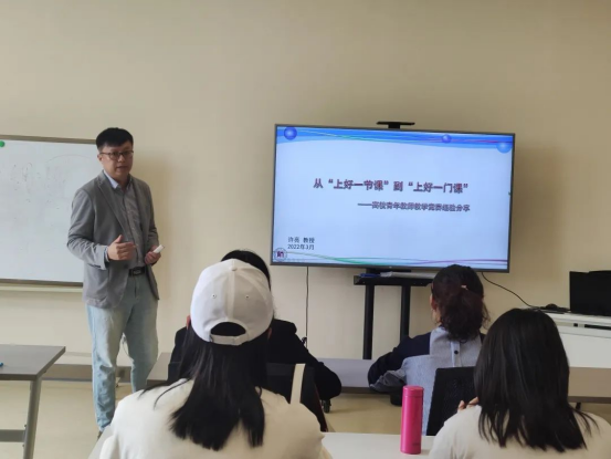 个人赛班次由教务处副处长卢林主持,邀请到全国“五一”劳动奖章,全国青年教师教学能力大赛一等奖获得者、贵州师范大学许亮教授以面授的形式对个人赛备赛教师进行培训。许亮教授以《从“上好一节课”到“上好一门课”——高校青年教师教学竞赛经验分享》为主题,以数学竞赛为例介绍了常见的竞赛形式,解读了竞赛内容,分析了教育理念、技能技巧和学科知识的关系,建议青年教师在教育理论知识、学科专业知识和教育技术知识上积蓄能量,厚积薄发。