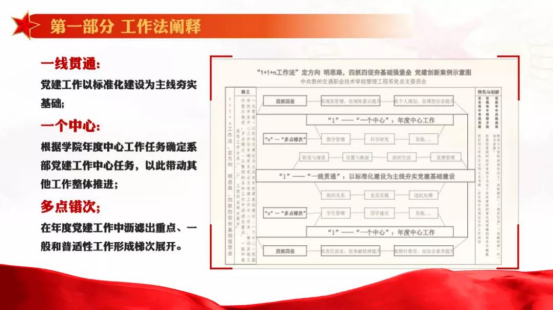 学院管理工程系党总支通过多年的实践,创新党建与育人融合的工作方法,总结提炼“‘1+1+n’工作法,定方向、明思路,四抓四促夯基础强堡垒”,全面落实新时代党的建设总要求。“1+1+n工作法”(即一线贯通、一个中心、多点错次),一线贯通:党建工作以标准化建设为主线夯实基础;一个中心:根据学院年度中心工作确定系部党建工作中心任务,以此带动其他工作整体推进;多点错次:在年度党建工作中厘清重点、一般和普适性工作形成梯次展开。