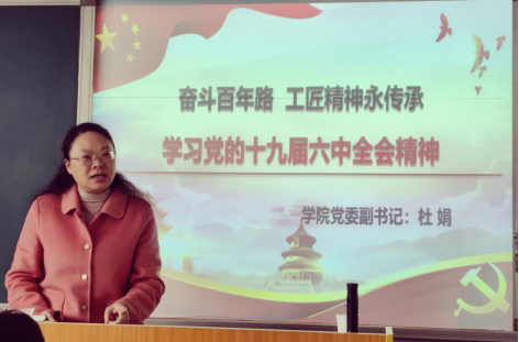 2021年12月7日,学院党委副书记杜娟为机电学子讲授了一堂题为《奋斗百年路 工匠精神永传承——学习党的十九届六中全会精神》的专题思政课。