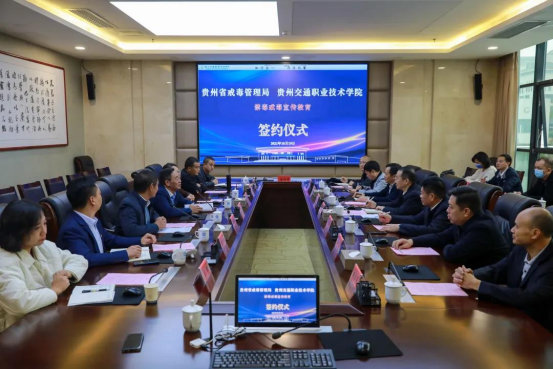 10月19日,贵州省戒毒管理局与贵州交通职业技术学院签订禁毒戒毒宣传教育合作协议。贵州省禁毒委委员、省司法厅党委委员、省戒毒局党委书记、局长张卫国和贵州交通职业技术学院党委副书记、院长吴有富出席并代表双方签署协议。省禁毒办副主任、省戒毒局党委委员、副局长赵军和贵州交通职业技术学院党委副书记杜娟出席并见证了签约仪式。