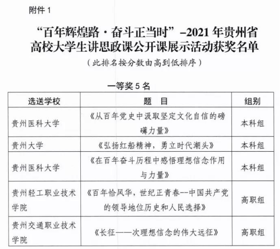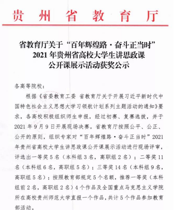 2021年9月8日,由省委教育工委、省教育厅主办的“百年辉煌路·奋斗正当时”——2021年贵州省高校大学生讲思政课公开课展示活动现场决赛传来喜讯。我院建筑工程系市政工程专业李艳玲同学主讲的《长征——一次理想信念的伟大远征》在激烈竞争中脱颖而出,获得高职高专组省赛一等奖的优异成绩,并获推荐参加国赛。获奖作品由基础教学部熊燕霞、宫秀琪教师指导。