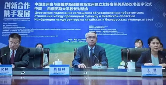 为进一步深化贵州与维吉布斯克州友好关系,推动中国与白俄罗斯在教育领域的交流,“贵州省与维捷布斯克州建立友好省州关系协议书签字仪式暨中国-白俄罗斯大学校长对话会”于2021年8月25日下午14:00在云端线上举办。此次对话由贵州省外事办公室(贵州省人民对外友好协会)会同贵州省教育厅、贵州师范大学、广东-独联体国际科技合作联盟、白俄罗斯驻广州总领事馆、白俄罗斯维捷布斯克州执委会经济委员会、维捷布斯克州执委会教育总局共同举办。贵州多所高校共同参加此次对话,学院副院长詹黔江、基础部(国际教育部)副主任冉江兰、学院办公室(外事办)负责人受邀出席线上会议。