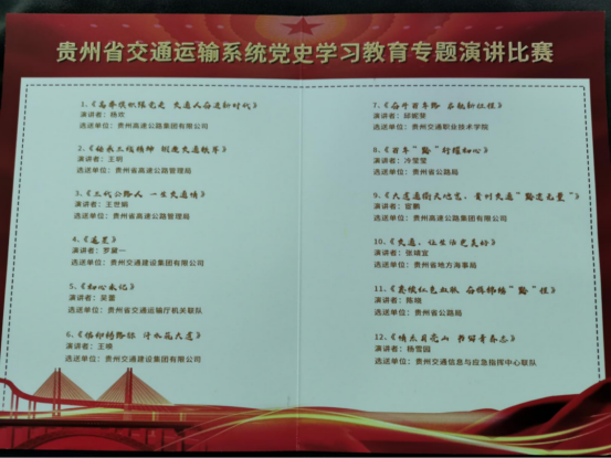 据悉,本次比赛设一等奖2名,二等奖3名,三等奖3名,共12名选手进入决赛。决赛现场,选手们或娓娓道来、情真意切,或慷慨激昂、热情澎湃,讲述了中国共产党成立100周年贵州交通运输发展的巨大成就。